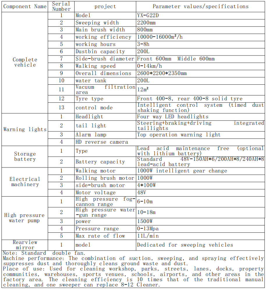 Áit úsáide: Úsáidte chun ceardlann glantacháin, páirceanna, sráideanna, lánaí, duganna, pobail réadmhaoine, stórais, ionaid spóirt, scoileanna, aerfoirt, agus limistéir eile i gceantar an fhearais. Is é an éifeachtúlacht glantacháin ná 10 n-uaire níos mó ná an lámhleabhar traidisiúnta, agus is féidir le scuabaire amháin ionad 8-12 glantóir a chur in ionad.