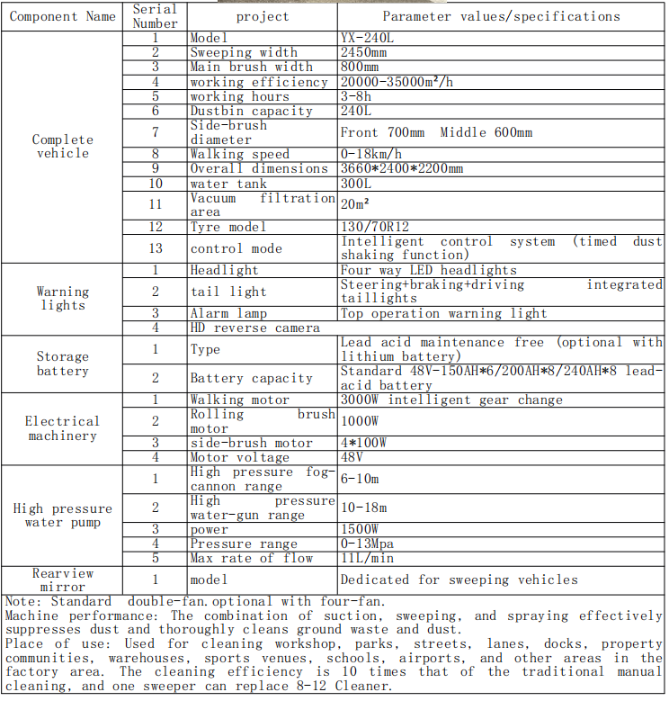 Áit úsáide: Úsáidte chun ceardlann glantacháin, páirceanna, sráideanna, lánaí, duganna, pobail réadmhaoine, stórais, ionaid spóirt, scoileanna, aerfoirt, agus limistéir eile i gceantar an fhearais. Is é an éifeachtúlacht glantacháin ná 10 n-uaire níos mó ná an lámhleabhar traidisiúnta, agus is féidir le scuabaire amháin ionad 8-12 glantóir a chur in ionad.